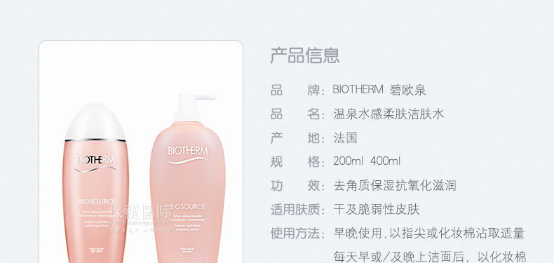 法國Biotherm碧歐泉MAGNESIUM溫泉水感柔膚潔膚水 保濕爽膚水(200ml/400ml)—— 1、碧歐泉溫泉水感柔膚潔膚水是無色的爽膚水,含淡淡清香。 2、能有效凈膚、保濕,輕易抹走老化角質,有助后續保養品的吸收。同時亦為肌膚帶來天然光澤,令肌膚柔嫩及舒適。