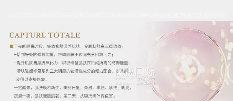 法國 DIOR 迪奧 CAPTURE XP 活膚抗皺晚霜 提拉緊致 抗皺 去皺(50ml)—— 1 為肌膚帶來極致舒適、彈性及生氣 2 肌膚能得到夜間的強(qiáng)效修護(hù)再生,面容不再倦怠,舒緩,均勻,有光澤 3 Capture R60/80修護(hù)晚霜能密集再生修復(fù)肌膚,撫平皺紋與細(xì)紋。同時(shí)能強(qiáng)化并深層重建肌膚,肌膚變得更緊致光滑。 |