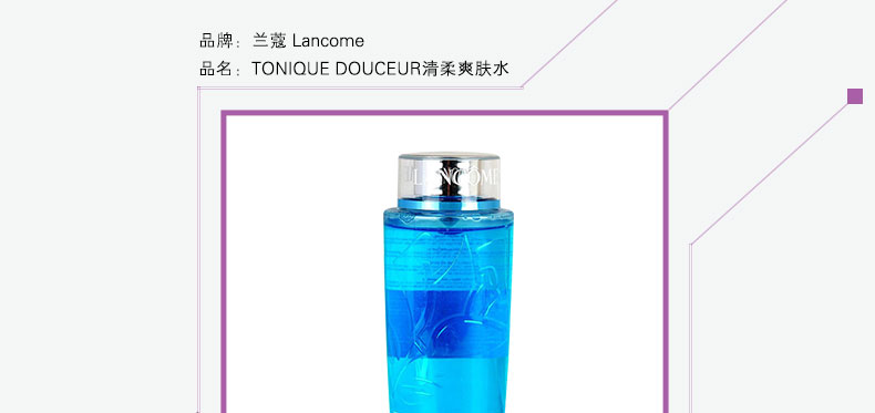 蘭蔻 TONIQUE DOUCEUR清柔爽膚水(不含酒精) 藍瓶保濕化妝水—— 1、蘊含玫瑰、接骨木精華,有刺激和軟化肌膚作用。 2、天然醣份能產生保濕功能。 注:敏感肌膚慎用,可隱蔽處進行皮膚測試后使用。 |