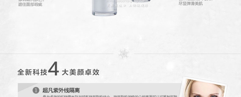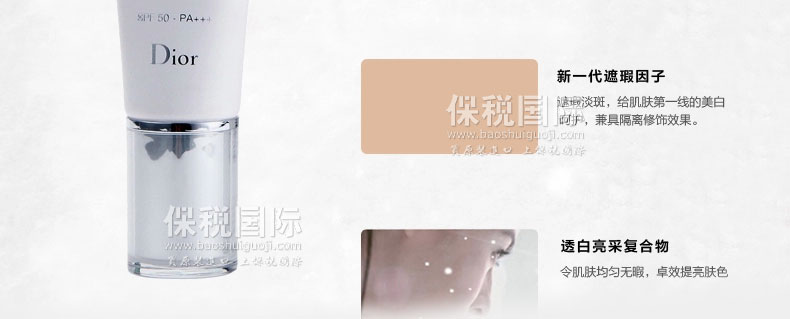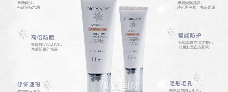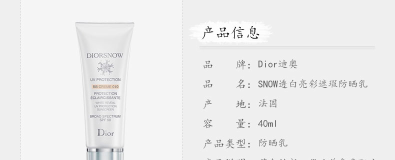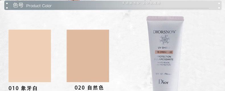 法國迪奧DIOR SNOW雪晶靈UV SHIELD 雪凝亮白BB肌色防曬SPF 50 PA+++ (40ml)—— 1.高度防護(hù)肌膚溫度及濕度變化,免受紫外線侵害。 2.涂抹后實(shí)時減淡黑班及瑕疵部位,肌膚亮白無瑕。 3.蘊(yùn)含獨(dú)家的新一代色彩改善色素,將保護(hù)和修飾作用合而為一。 |