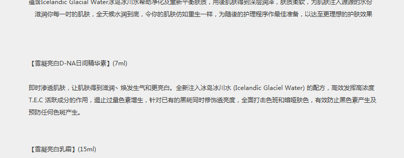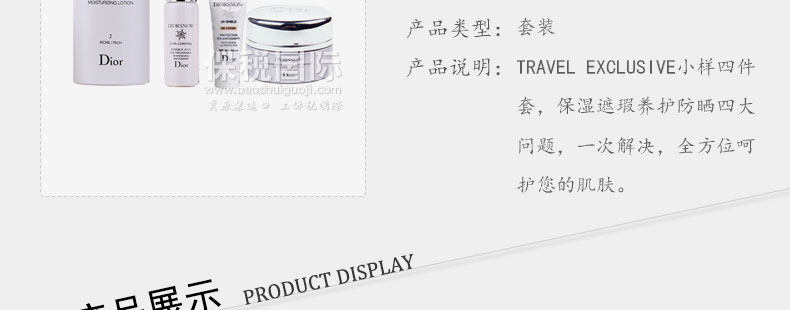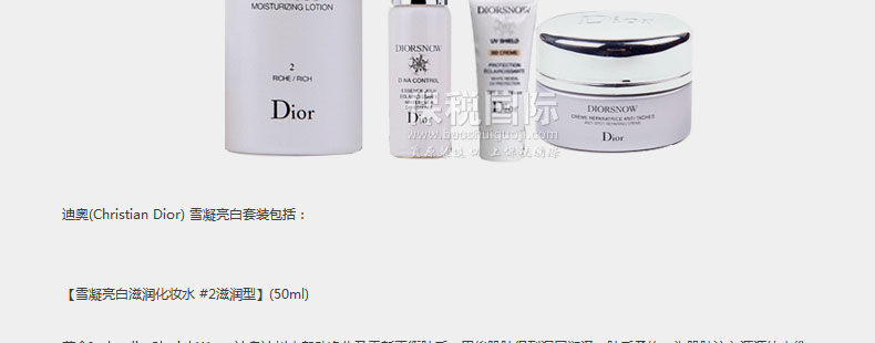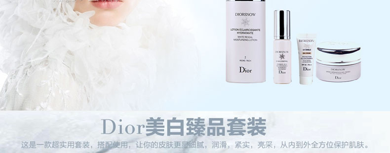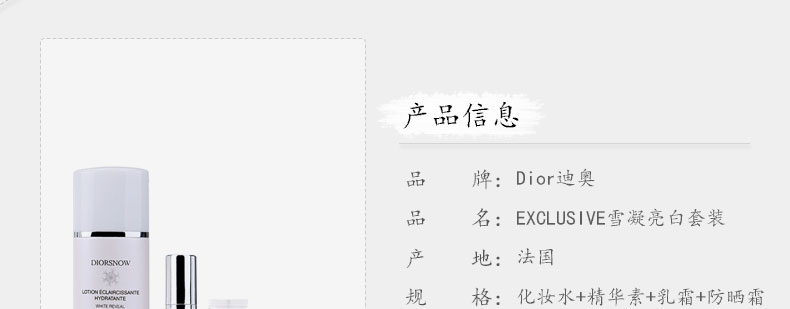 法國迪奧 TRAVEL EXCLUSIVE雪凝亮白套裝(化妝水+精華素+乳霜+防曬霜)—— 【化妝水 #2滋潤型】(50ml)用后肌膚得到深層潤澤,膚質柔軟。 【D-NA日間精華素】(7ml)肌膚得到滋潤丶煥發生氣和更亮白。 【乳霜】(15ml)肌膚更豐盈更有彈性,水潤。 【BB肌色防曬SPF50 PA+++】(10ml)質感清爽,能完美修飾膚色。 |