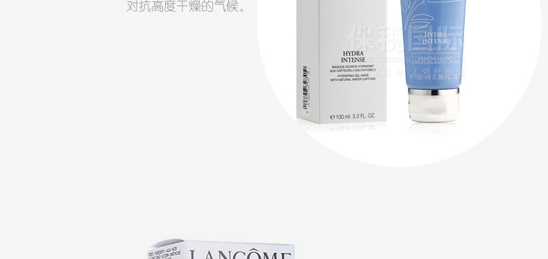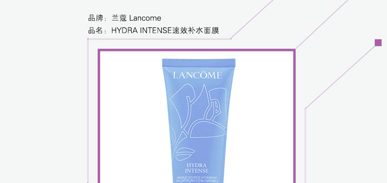 蘭蔻HYDRA INTENSE速效補水面膜 天然深層水份面膜(100ml)—— 1、天然水份保濕因子,能極有效地對抗高度干燥的氣候。. 2、使用方法:將面膜厚厚地涂一層于臉上,待5分鐘,再用化妝棉將多余的面膜抹掉,不需用水清洗。 |