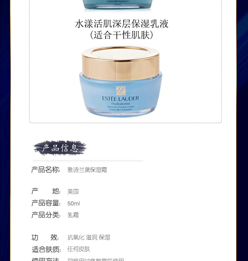 美國 雅詩蘭黛 HYDRATIONIST 水晶瑩極致保濕系列保濕霜 (50ml) —— 1.提供實時且持久的滋潤,抵御過早老化跡象。 2.持續使用四星期,能提高肌膚保濕屏障的強度50%。 |