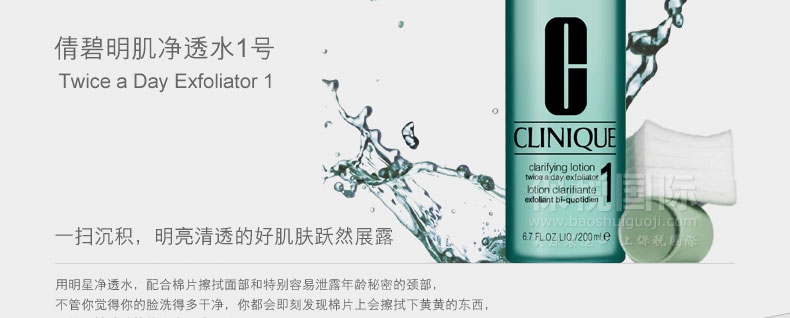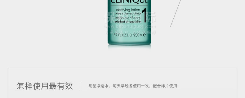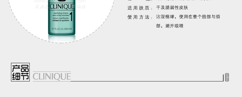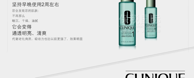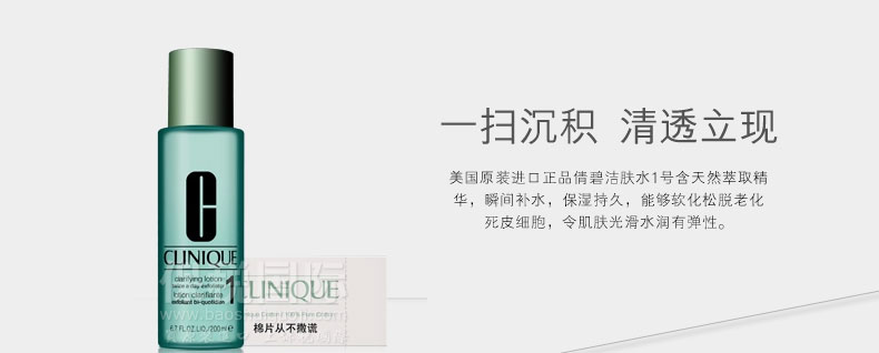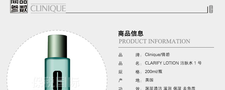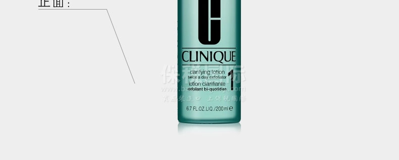 Clinique/倩碧 CLARIFY LOTION 潔膚水 1 號(Version 2) 清潔保濕爽膚水 (200ml)—— 1 瞬間補水,長久保濕,可加強肌膚天然滋潤保護膜 2 溫和清理皮層,促進肌膚自我更新,有效軟化及松脫老化死皮細胞 3 清爽水質配方瞬間發揮奇妙功效,賦予肌膚晶瑩剔透,抵御干燥與外在壓力的侵害 |