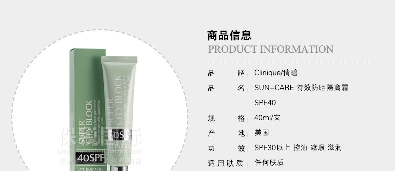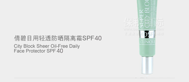 | 產品說明 | Clinique/倩碧 SUN-CARE 特效防曬隔離霜SPF40? 遮瑕 控油 (40ml)—— 1 無油配方,清爽輕盈;可單獨或作化妝前打底 2 質地輕薄,持久防護隔離臟空氣,夏天必備 | |||