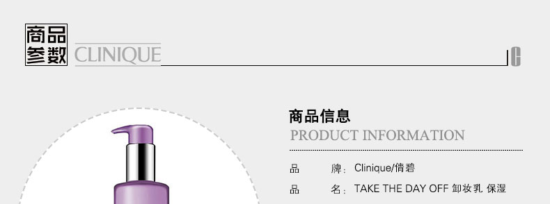 Clinique/倩碧 TAKE THE DAY OFF 卸妝乳 保濕卸妝乳 (200ml) —— 1. 性質溫和,令肌膚保持滋潤細致,不會引起干燥、緊繃或不適。 2. 持續使用能增加肌膚屏障的強勁程度,有助維持皮膚的天然水份平衡。 3. 干性皮膚理想的卸妝工具,適合所有類型的肌膚。 |
