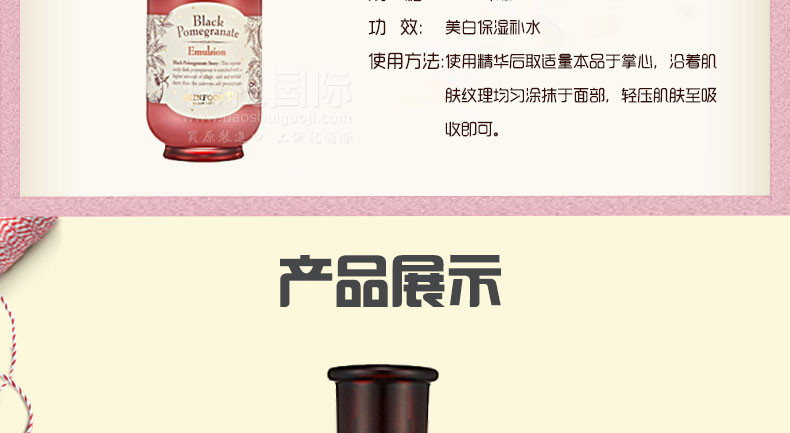 韓國(guó) 思親膚Skin Food 黑石榴抗氧化乳液 滋養(yǎng)強(qiáng)效保濕美白乳 150ml/瓶 —— 黑石榴富含豐富的礦物質(zhì),并含有鈣、鎂、鋅等微量元素萃取精華,能迅速為肌膚補(bǔ)充水分,令膚質(zhì)更為明亮柔潤(rùn),具有抗皺,增加彈力,保濕,抗老化的技能。保濕補(bǔ)水,緩解皮膚暗沉。 |