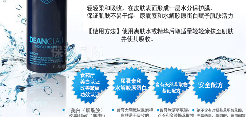 | 產(chǎn)品說(shuō)明 | 韓國(guó) DEANCLAU INDIGO DENIM 靛藍(lán)牛仔男士護(hù)膚三件套? 美白 改善皺紋? (爽膚水+潤(rùn)膚液+精華液)—— 爽膚水: 采用天然萃取物和安全配方制作,無(wú)油膩感,保濕,補(bǔ)水?? 潤(rùn)膚液: 在皮膚表層形成一層水分保護(hù)膜,尿囊素和水解膠原蛋白賦予肌膚活力??? 精華液: 含有發(fā)酵萃取物,集中護(hù)理干燥粗糙的男性肌膚 | |||