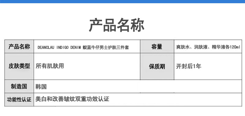 ![]() | 商品名稱 | 韓國(guó) DEANCLAU INDIGO DENIM 靛藍(lán)牛仔男士護(hù)膚三件套? 美白 改善皺紋? (爽膚水+潤(rùn)膚液+精華液) | ||