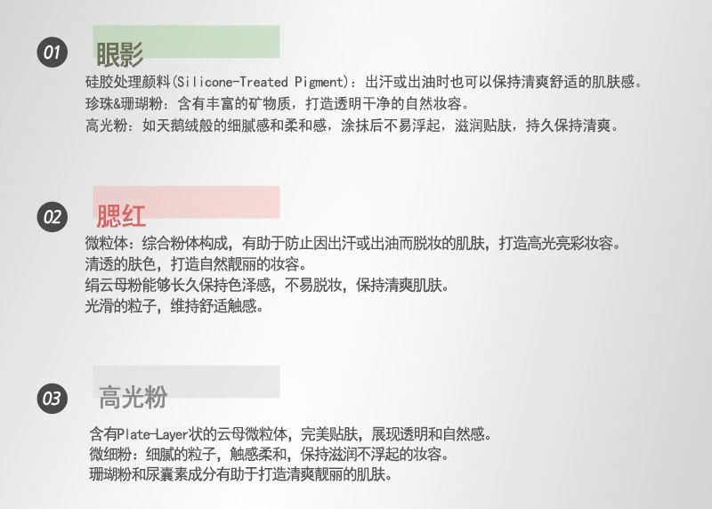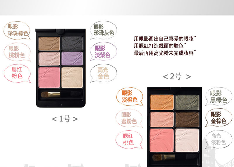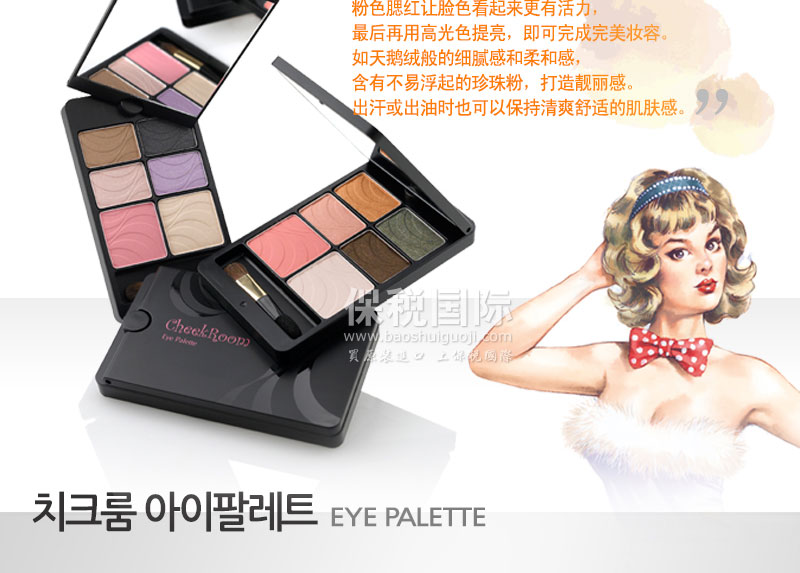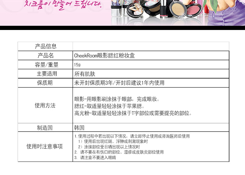 韓國【CheekRoom】眼影腮紅粉妝盒 15g∕盒 清爽 不油膩 滋潤 不浮起—— 1.眼影-用眼影刷涂抹于眼部,完成眼妝。 2.腮紅-取適量輕輕涂抹于蘋果腮。 3.高光粉-取適量輕輕涂抹于T字部位或需要提亮的部位。 |