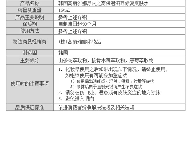 韓國高麗雅娜舒內之高保濕滋養修復爽膚水 150ml 補水 保濕 |