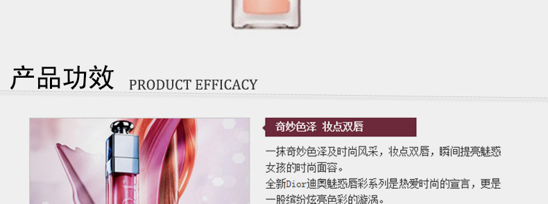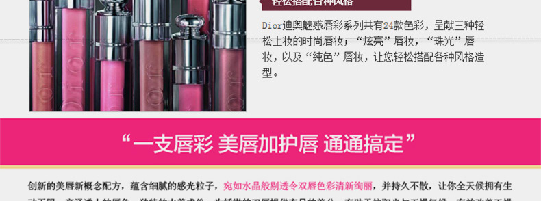 法國 DIOR迪奧 DIOR ADDICT 全新魅惑唇彩 誘惑魔力鏡光唇彩 (6.5ml)—— 1、撫平細紋,馬上令櫻唇變得豐盈。 2、創新唇掃,讓妳輕易精確地涂抹。 3、不含蠟質成分,只以純粹水份合成,水潤雙唇煥發清新動人的裸膚妝感。 |