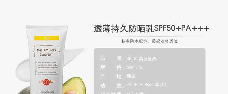 DR.G 美麗世界 SUN CARE 透薄持久防曬乳 SPF50+PA+++ 無色素 性質溫和(60ml/支)—— 1.不含色素,性質溫和。不刺激皮膚,涂抹后亦不會留下白色殘跡。 2.含較高SPF及PA指數,有效抵擋UVA及UVB,防曬效果長達15小時,減少補涂的煩惱。 |