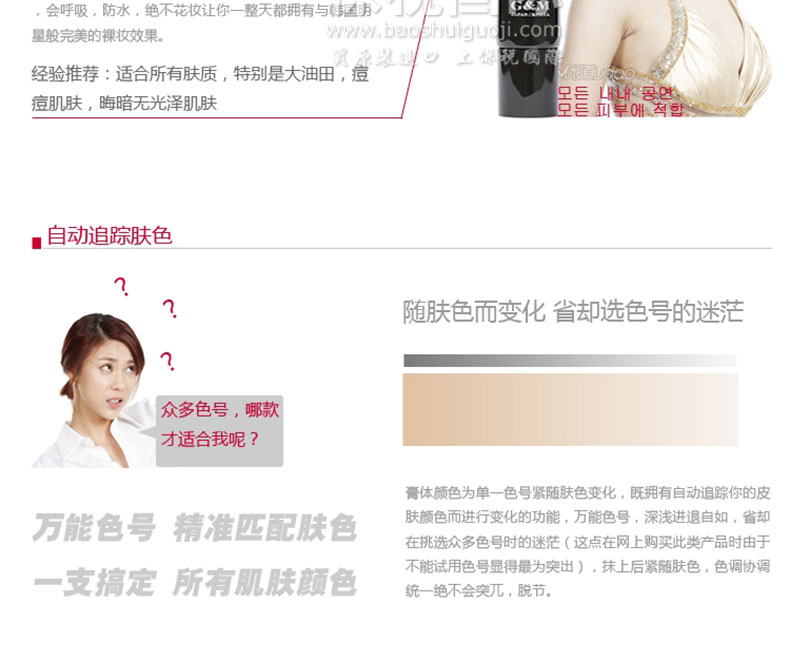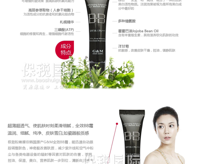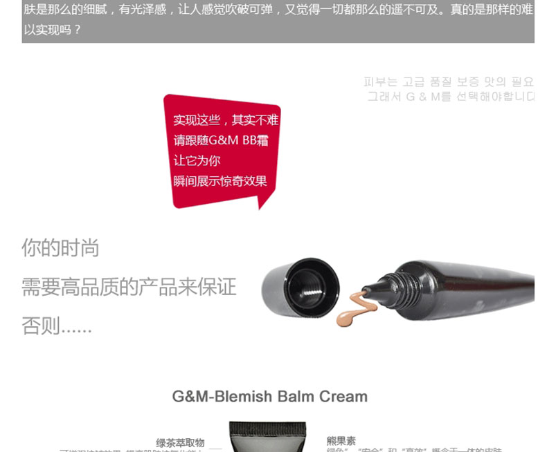 韓國 G&M高美全效能BB霜 便攜版輕巧便于攜帶BB霜—— 1.適合所有膚質,特別是大油田,痘痘肌膚,晦暗無光澤肌膚。 2.隨膚色而變化,省卻選色號的迷茫。 3.可以輕松上妝且使妝更容易貼合,均勻你的膚色。 |