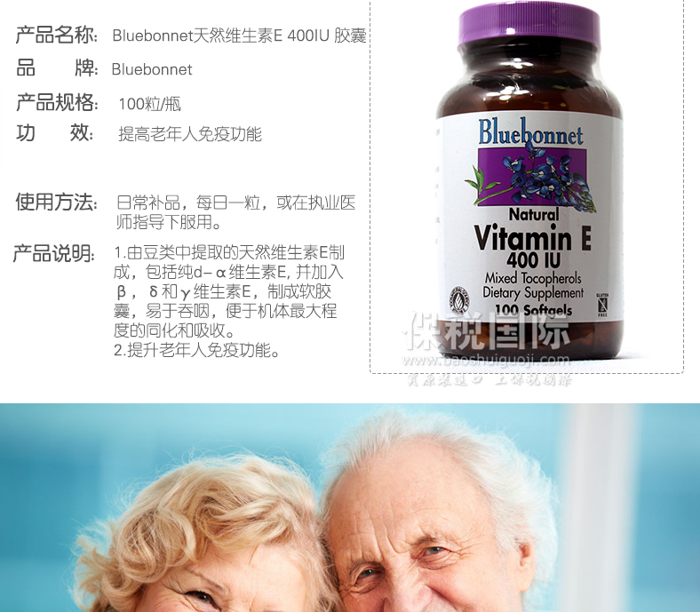 | 產品說明 | Bluebonnet 天然維生素E 400IU 膠囊 提高老年人免疫功能 (100粒/瓶)—— 1.由豆類中提取的天然維生素E制成,包括純d-α維生素E, 并加入β,δ和γ維生素E,制成軟膠囊,易于吞咽,便于機體最大程度的同化和吸收。 2.提升老年人免疫功能。 | |||