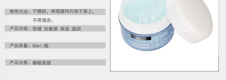 | 產品說明 | DR.G 美麗世界 SUPER AQUASIS 極致水感保濕睡眠面膜 保濕抗敏感(80ml/瓶)—— 1.集舒緩、保濕、提升皮膚能量功效于一身,擊退干燥缺水的煩惱,肌膚瞬間重現光澤,展現水感美肌。 2.散發清新海洋氣息,放松舒緩,有助入睡。于睡眠時修復肌膚,令肌膚恢復神采活力。 使用方法:于睡前,將面膜均勻涂于面上,不用清洗。 | |||