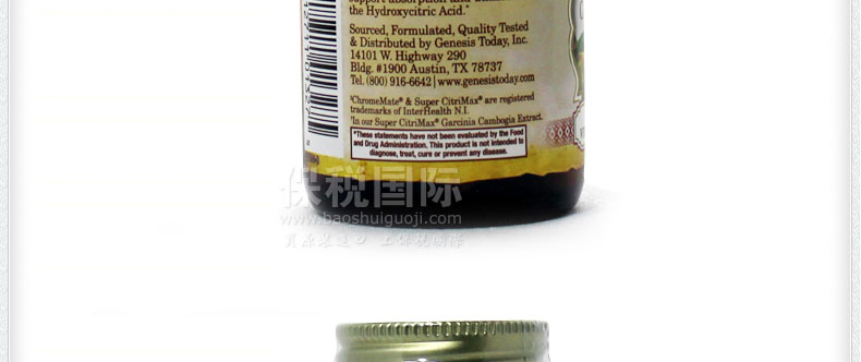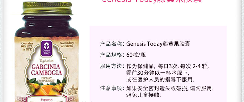 | 產(chǎn)品說明 | Genesis Today 藤黃果 60粒素食膠囊 控制食欲 減少脂肪形成 —— 1 包含60%的HCA和GCE 2 無粘結(jié)劑或填沖料 3 幫助控制體重,減少脂肪的形成 | |||
