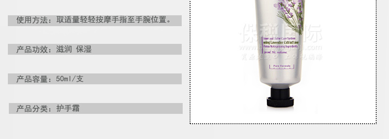 | 產(chǎn)品說明 | DR.G 美麗世界 SPECIAL CARE 薰衣草保濕潤手霜 滋潤保濕防裂抗衰老(50ml/支)—— 1.主要成份包括薰衣草油,茶樹油,摩洛哥堅果油,木瓜萃取,瞬間為手部肌膚提供大量水份,同時抵御肌膚衰老。 2.用后雙手如絲綢般柔滑。質(zhì)地輕柔清爽,使雙手肌膚恢復柔嫩。長期時用能提供雙手深層呵護。 使用方法:取適量輕輕按摩手指至手腕位置。 | |||
