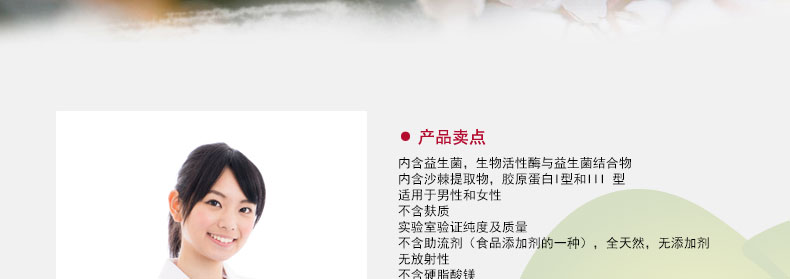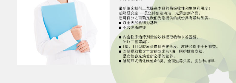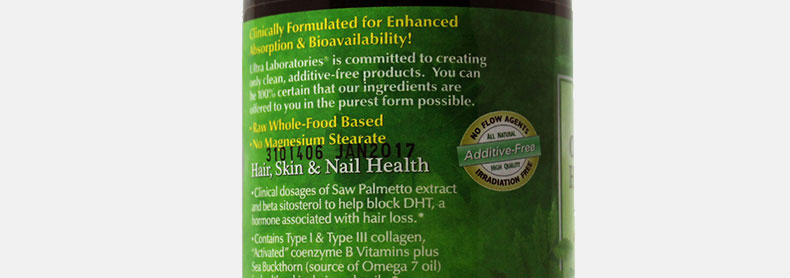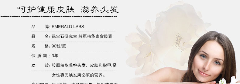 | 產品說明 | Emerald Labs 綠寶石研究室 膠原精華素食膠囊 呵護健康皮膚 滋養頭發(90粒/瓶) —— 1.沙棘提取物含豐富的歐米茄7油,呵護健康皮膚,是女性容光煥發所必須的營養。 2.輔酶形式活化維他命B類,全面滋養頭發,皮膚和指甲。 3.內含臨床治療劑量的沙棘提取物和β谷固醇,可雙重阻斷與脫發密切相關的激素DHT(二氫睪酮)。 4.以全天然食物為基質。 5.不含硬脂酸鎂。 | |||