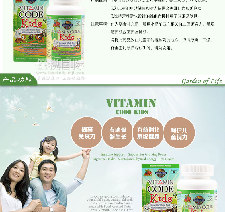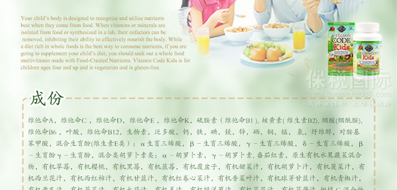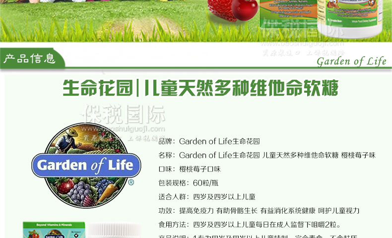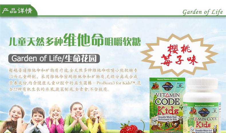 Garden of Life生命花園 兒童天然多種維他命軟糖 櫻桃莓子口味 60粒/瓶—— 1.專為四歲及四歲以上兒童特制,完全素食,不含麩質(zhì)。 2.為兒童的卓越健康和活力提供必需維他命和礦物質(zhì)。 3.獨(dú)特營(yíng)養(yǎng)需求設(shè)計(jì)的維他命櫻桃莓子味咀嚼軟糖。 溫馨提示:此款商品即將臨期,下單后不因商品臨期而退款,購(gòu)買時(shí)請(qǐng)知悉! |