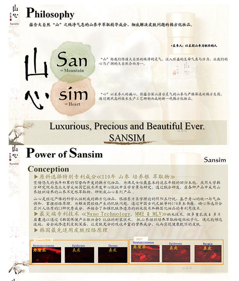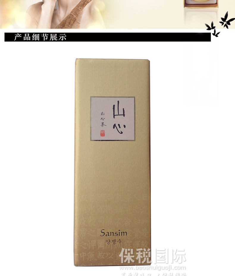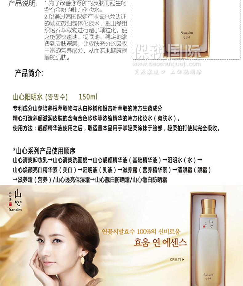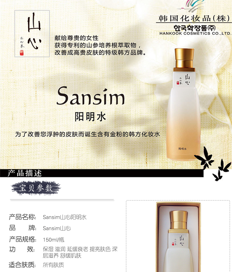 韓國(guó) Sansim山心 高級(jí)韓方護(hù)膚品 陽(yáng)明水 保濕滋潤(rùn)(150ml/瓶)—— 1.為了改善您浮腫的皮膚而誕生的含有金粉的韓方化妝水。 2.以通過(guò)韓國(guó)保健產(chǎn)業(yè)振興會(huì)認(rèn)證的顆粒微細(xì)包體化技術(shù),把山參組織培養(yǎng)萃取物進(jìn)行超小顆粒化,使之能夠快速地、徹底地、穩(wěn)定地滲透到皮膚深層,讓皮膚充分的吸收豐富的營(yíng)養(yǎng)成分,從而實(shí)現(xiàn)健康靚麗的肌膚。 注:敏感肌膚慎用,可隱蔽處進(jìn)行皮膚測(cè)試后使用。 |