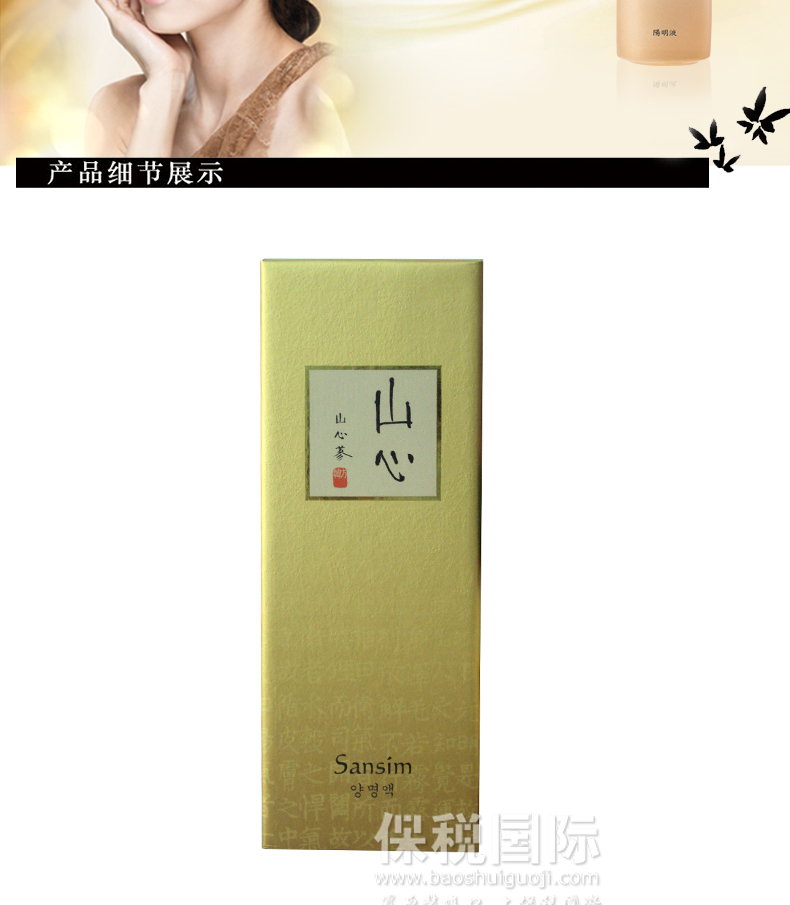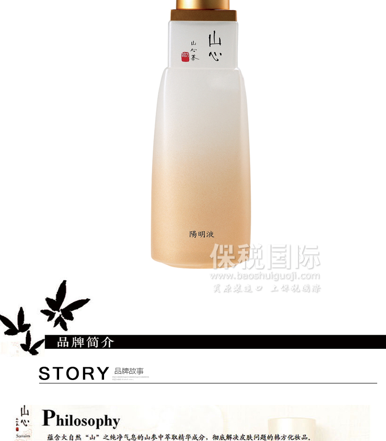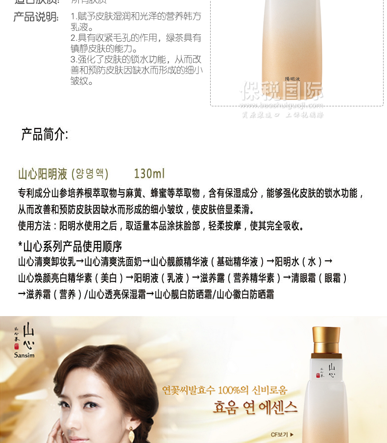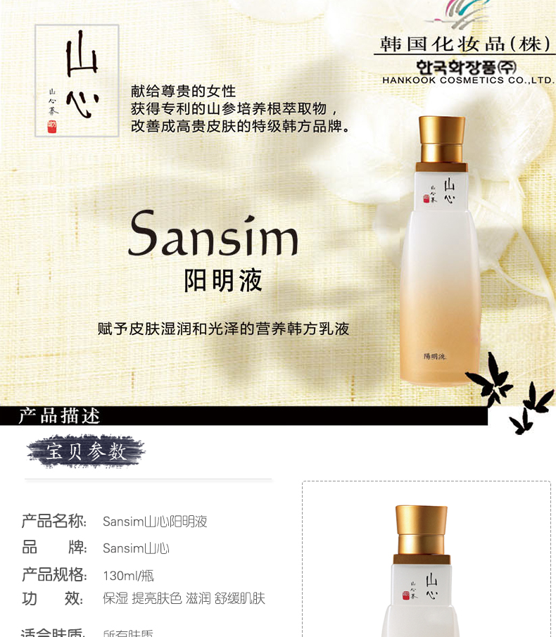 韓國 Sansim 山心 陽明液 提亮膚色 美白滋潤(130ml/瓶)—— 1.賦予皮膚濕潤和光澤的營養韓方乳液。 2.具有收緊毛孔的作用,綠茶具有鎮靜皮膚的能力。 3.強化了皮膚的鎖水功能,從而改善和預防皮膚因缺水而形成的細小皺紋。 注:敏感肌膚慎用,可隱蔽處進行皮膚測試后使用。 |
