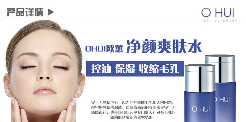 韓國 OHUI歐蕙 凈顏爽膚水 控油保濕 收縮毛孔化妝水(150ml/瓶)—— 1.凈化肌膚環境的同時重找肌膚的均衡,是一款打造更加健康干凈通透肌膚的專門產品。 2.可以解決油性肌膚的惡性循環,還可以幫您改善肌膚,打造通透的肌膚狀態。 3.可以凈化肌膚,重建紊亂的肌膚均衡世界,維持肌膚油水分均衡,演繹如天使眼淚般滋潤、如絲般柔滑的肌膚。 使用方法:洗臉后取約一元硬幣大小的本品于化妝棉上,擦拭于臉上即可。 注:敏感肌膚慎用,可隱蔽處進行皮膚測試后使用。 |