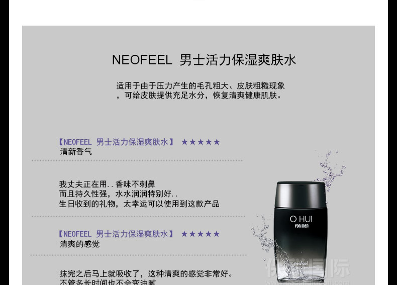 | 產(chǎn)品說(shuō)明 | 韓國(guó) OHUI歐蕙 NEOFEEL男士活力保濕爽膚水 控油保濕(135ml/瓶)—— 適用于由于壓力產(chǎn)生的毛孔粗大、皮膚粗糙現(xiàn)象,可給皮膚提供充足水分,恢復(fù)清爽健康肌膚。 使用方法:洗臉或剃須后,取適量輕輕拍打涂抹于面部、手部、頸部等。 | |||