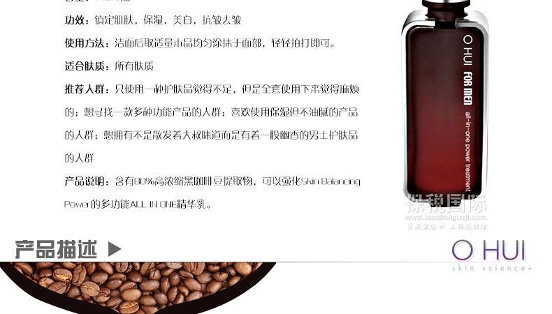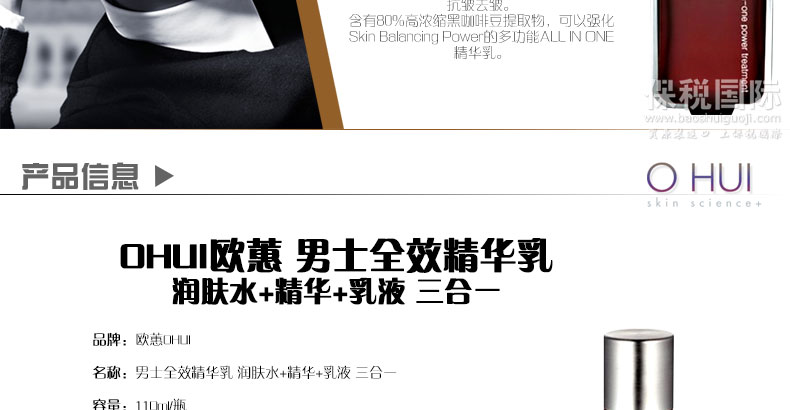 | 產品說明 | 韓國 OHUI歐蕙 男士全效精華乳 潤膚水+精華+乳液 三合一 (110ml/瓶)—— 含有80%高濃縮黑咖啡豆提取物,可以強化Skin Balancing Power的多功能ALL IN ONE精華乳。 | |||