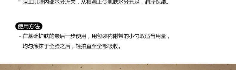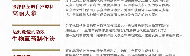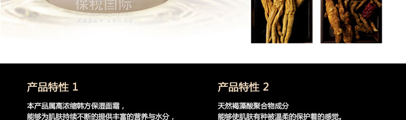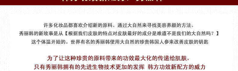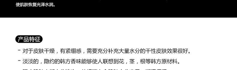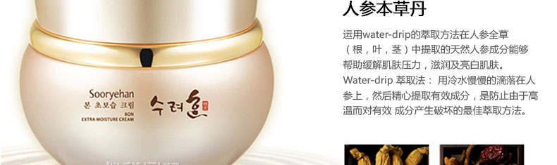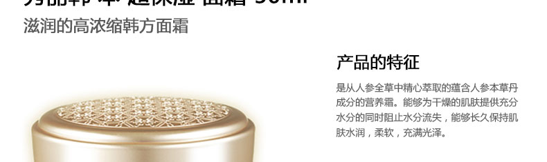 韓國(guó) 秀麗韓 本 超保濕面霜 長(zhǎng)久維持肌膚水潤(rùn)(50ml/瓶)—— 1.是從人參全草中精心萃取的蘊(yùn)含人參本草丹成分的營(yíng)養(yǎng)霜。 2.能夠?yàn)楦稍锏募∧w提供充分水分。 3.阻止水分流失,能夠長(zhǎng)久保持肌膚水潤(rùn),柔軟,充滿光澤。 |