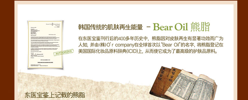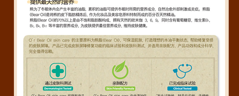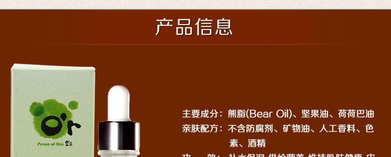 韓國 O'r 熊脂精油30ml/瓶 滋養(yǎng)肌膚—— 1. 熊為了冬眠體內(nèi)會產(chǎn)生豐富的油脂,累積的油脂可提供冬眠時所需的營養(yǎng)成分,自然治愈外部刺激或炎癥。 2. 熊脂(Bear Oil)是將熊的皮下脂肪精煉后,作為化妝品及美容皂原料特制而成的百分百天然精油。 3. 熊脂(Bear Oil)的70%以上是由不飽和脂肪酸構(gòu)成,擁有天然的歐米伽3、6、9。 4. 同時含有葡萄糖苷、維生素B1、B2、B4、B12 等豐富的營養(yǎng)成分,為皮膚提供最佳營養(yǎng)成分,維持皮膚健康。 5. 由熊脂(Bear Oil)、堅果油等天然油脂調(diào)合而成,為皮膚提供高營養(yǎng)、高水分。 6. 緩解、鎮(zhèn)定因皮膚問題引起的刺激,幫助恢復(fù)受損的皮膚屏障。 使用方法:取產(chǎn)品2~3滴,均勻涂抹在干燥敏感的皮膚部位。同時使用O'r Bear Oil保濕乳液及舒緩乳液效果會更佳。 |