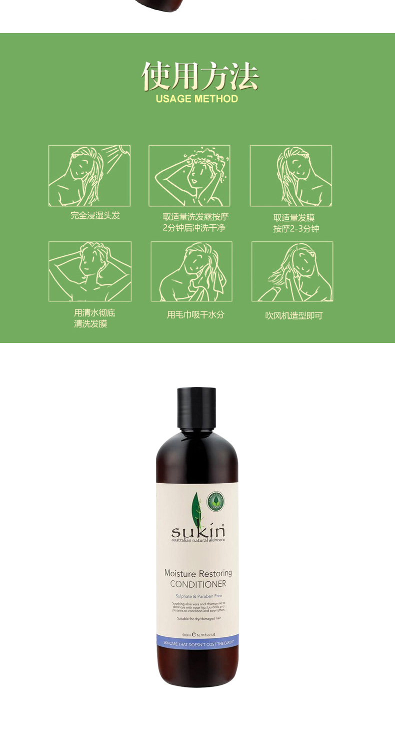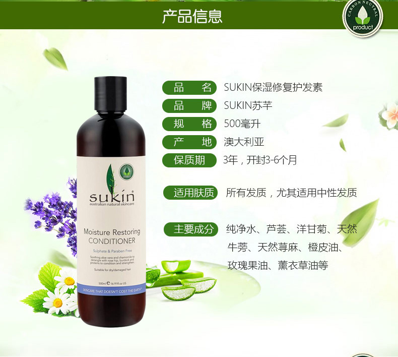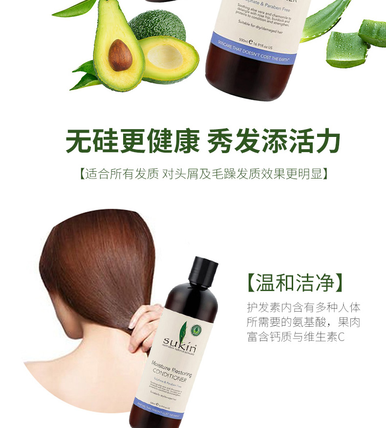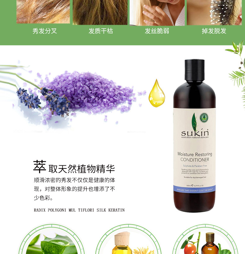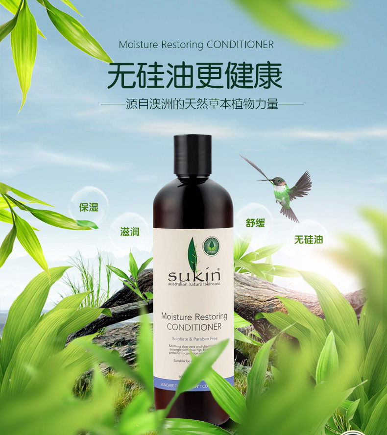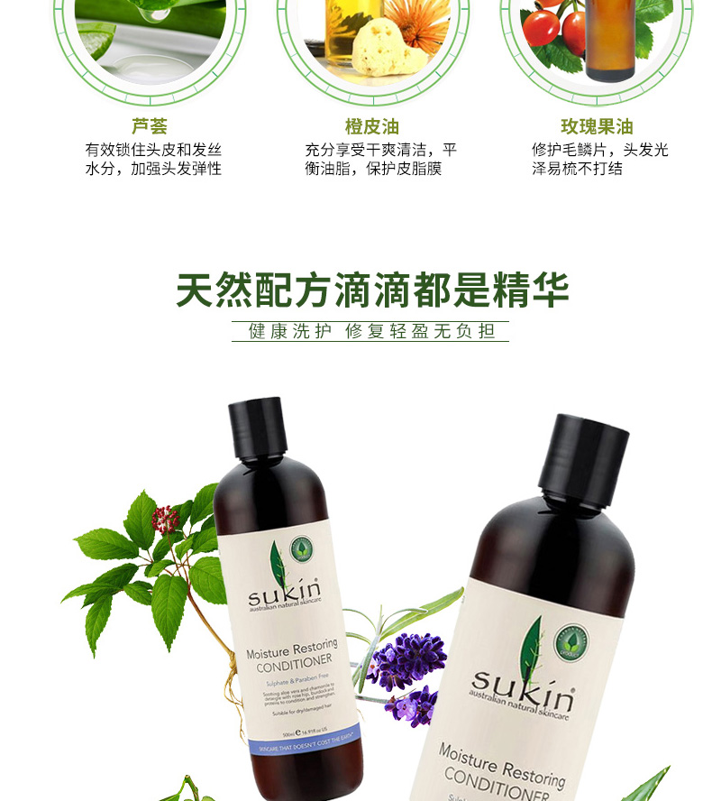 Sukin蘇芊 Moisture Restoring Conditioner 保濕修復(fù)護(hù)發(fā)素 天然草本精華 全面護(hù)理秀發(fā) 500ml/瓶 1、特別滋潤干枯或受損頭發(fā)。 2、含天然植物滋潤成分,令秀發(fā)如絲般順滑。 |