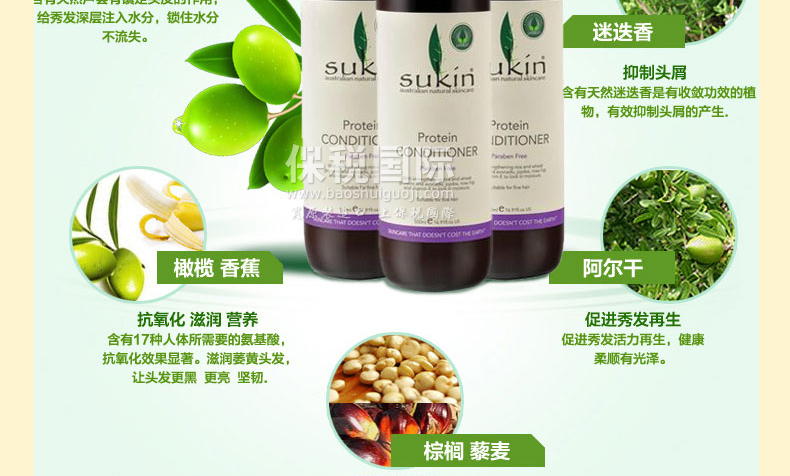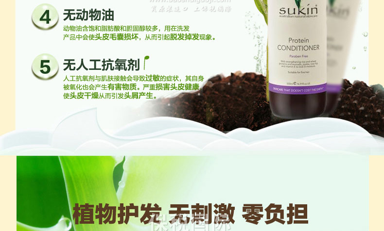 SUKIN蘇芊Protein Conditioner 蛋白滋養護發素 告別毛糙 讓秀發光滑柔順 500ml/瓶—— 1、Sukin護發素絕不含防腐劑和十二烷基硫酸鈉, 2、適合敏感頭皮,脆弱受損,缺乏營養的發質使用。 3、此款蛋白滋養護發素,能使頭發有光澤,柔順, 4、有助于防止頭發纏結。 |