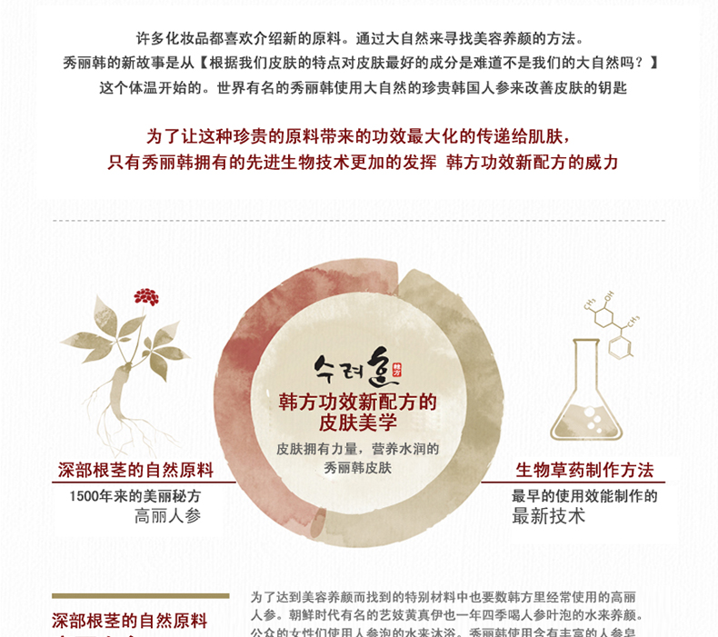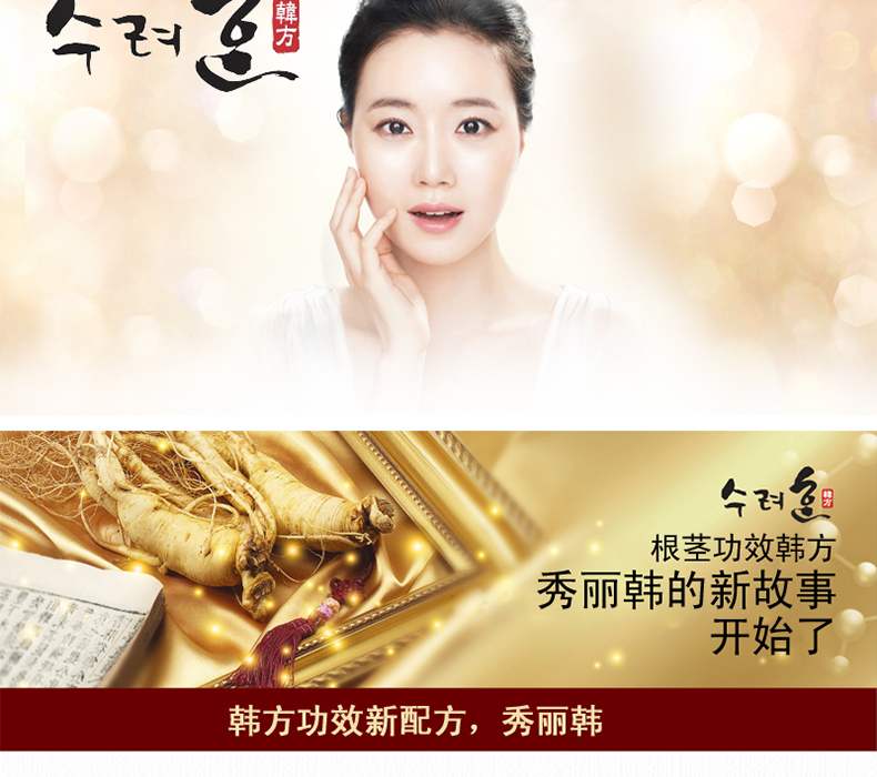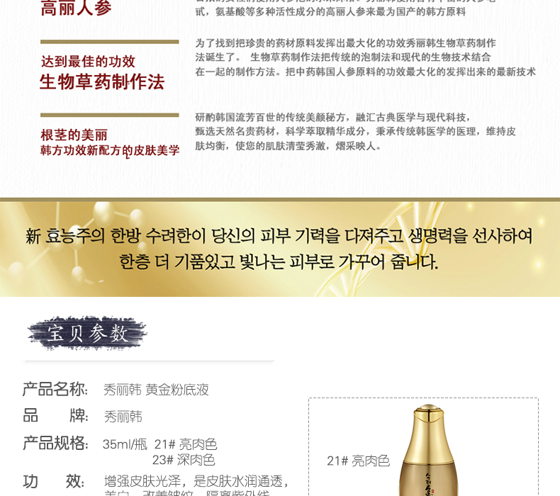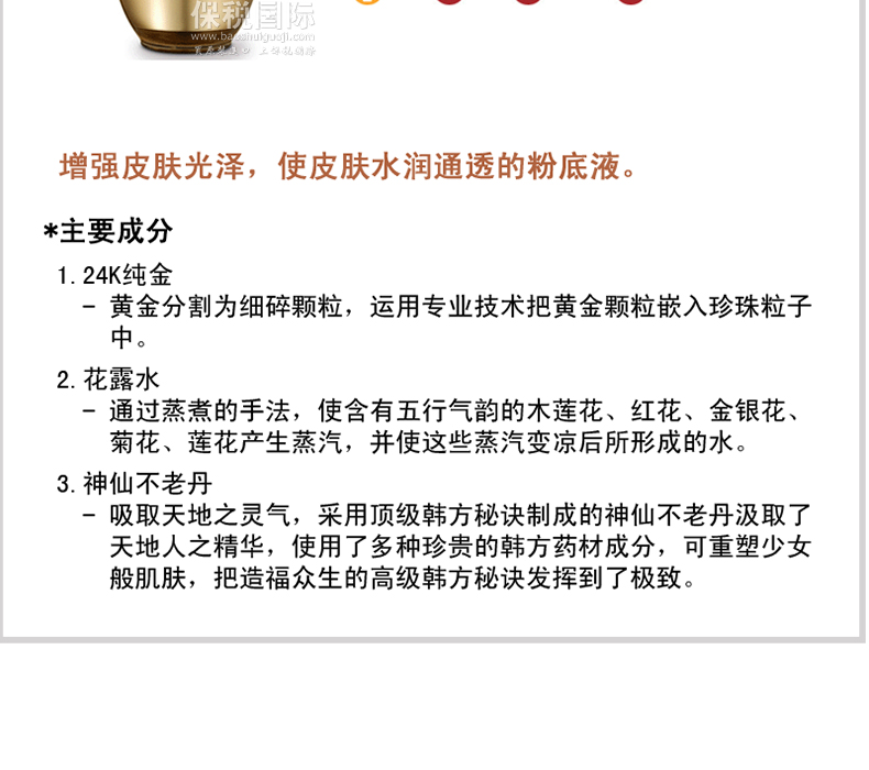| 產(chǎn)品說(shuō)明 | 韓國(guó)Sooryehan 秀麗韓 黃金粉底液—— 1.黃金分割為細(xì)碎顆粒,運(yùn)用專業(yè)技術(shù)把黃金顆粒嵌入珍珠粒子中。 2.通過(guò)蒸煮的手法,使含有五行氣韻的木蓮花、紅花、金銀花、菊花、蓮花產(chǎn)生蒸汽,并使這些蒸汽變涼后所形成的水。 3.吸取天地之靈氣,采用頂級(jí)韓方秘訣制成的神仙不老丹汲取了天地人之精華,使用了多種珍貴的韓方藥成分,可重塑少女般肌膚,把造福眾生的高級(jí)韓方秘訣發(fā)揮到了極致。 | |||