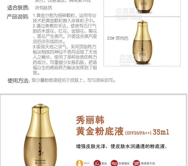 ![]() | 商品名稱 | 韓國(guó)Sooryehan 秀麗韓 黃金粉底液 | ||