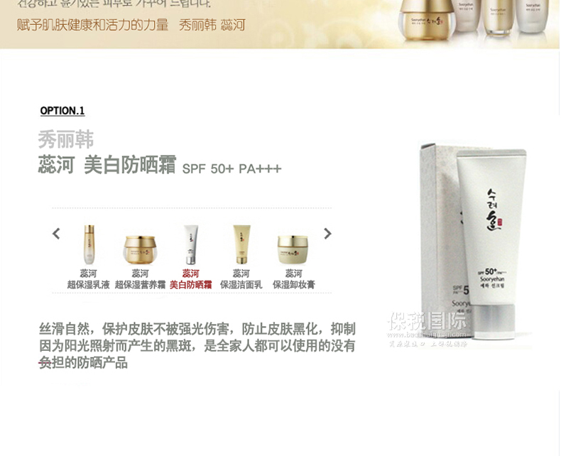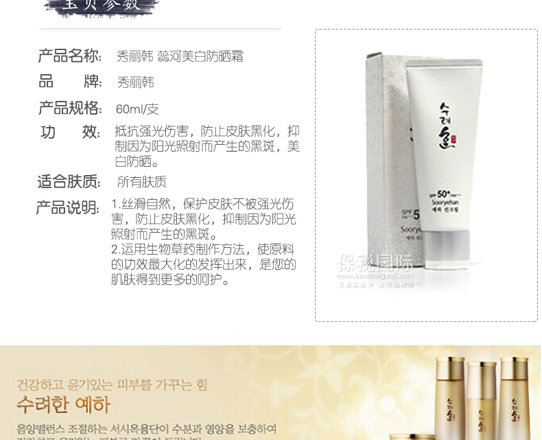 | 產品說明 | 韓國一線品牌 秀麗韓 蕊河對抗強光抑制黑斑美白防曬霜 SPF 50+ PA+++ 60ml/支—— 1.絲滑自然,保護皮膚不被強光傷害,防止皮膚黑化,抑制因為陽光照射而產生的黑斑。 2.運用生物草藥制作方法,使原料的功效最大化的發(fā)揮出來,是您的肌膚得到更多的呵護。 | |||