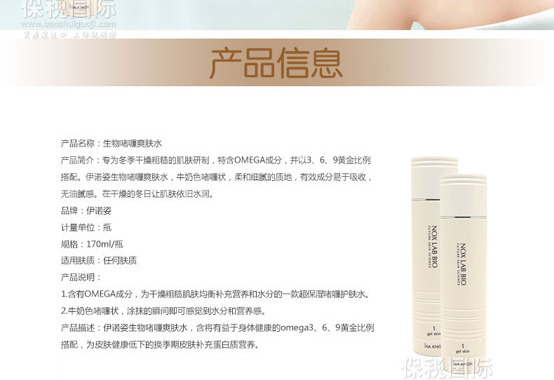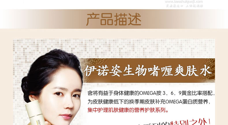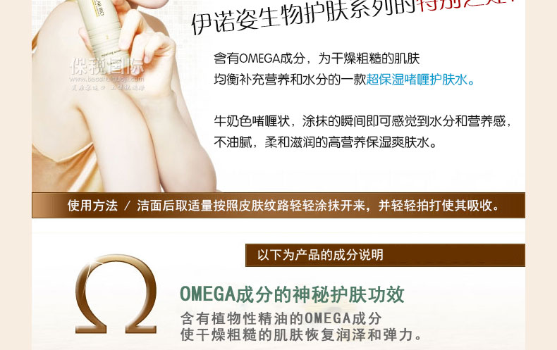 【伊諾姿】生物啫喱爽膚水 柔和滋潤 高營養—— 1.含有OMEGA成分,為干燥粗糙肌膚均衡補充營養和水分的一款超保濕啫喱護膚水。 2.牛奶色啫喱狀,涂抹的瞬間即可感覺到水分和營養感。 注:敏感肌膚慎用,可隱蔽處進行皮膚測試后使用。 |