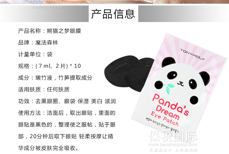 TonyMoly魔法森林熊貓之夢 去黑眼圈 去眼袋 保濕 美白 滋潤 眼膜眼貼 10對/盒 |