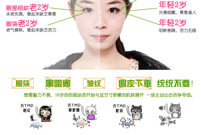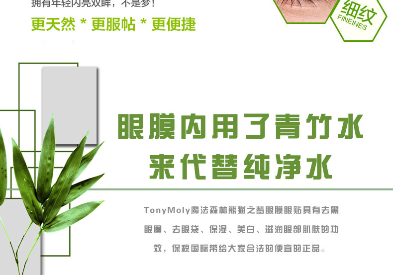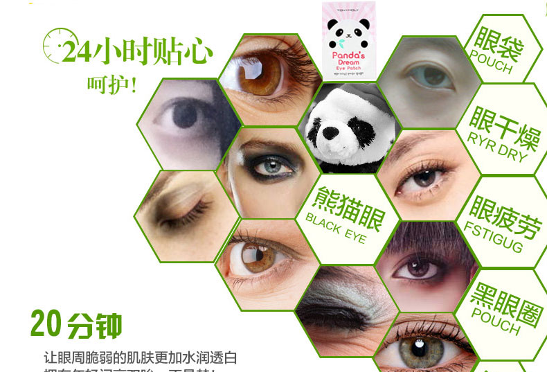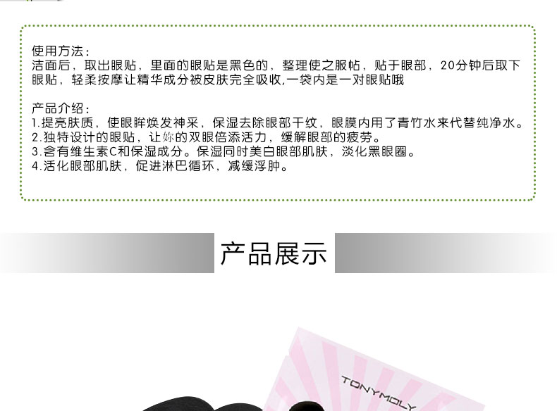 TonyMoly魔法森林熊貓之夢 去黑眼圈 去眼袋 保濕 美白 滋潤 眼膜眼貼 10對/盒—— 1.提亮膚質,使眼眸煥發神采,保濕去除眼部干紋,眼膜內用了青竹水來代替純凈水。 2.獨特設計的眼貼,讓妳的雙眼倍添活力,緩解眼部的疲勞。 3.含有維生素C和保濕成分。保濕同時美白眼部肌膚,淡化黑眼圈。 4.活化眼部肌膚,促進淋巴循環,減緩浮腫。 |