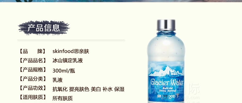 韓國 Skin food思親膚 冰山清爽鎮定乳液 多效合一 收縮毛孔(300ml/瓶)—— 富含冰山水成分,收緊毛孔,曬后鎮靜肌膚,清爽自然,天然冰山萃取的水,富含弱堿性水,鉀,鈣,鎂等礦物質成分。 使用方法:潔面后,取適量于掌心,順著肌膚紋理均勻涂抹。 |