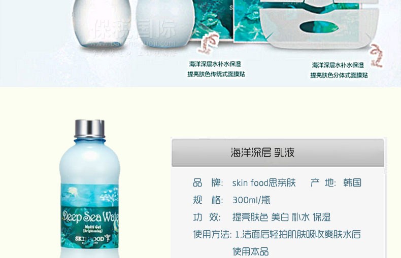 韓國 Skin food思親膚 海洋深層乳液 補水美白保濕乳(300ml/瓶)—— 1.海洋深層水,富含海底深層的水,讓肌膚白皙透亮,同時保持肌膚水潤。 2.海底深處的純天然水,持久的低溫狀態,含有礦物質成分。 使用方法: 1.潔面后輕拍肌膚吸收爽膚水后使用本品 2.沐浴后用作身體乳 |