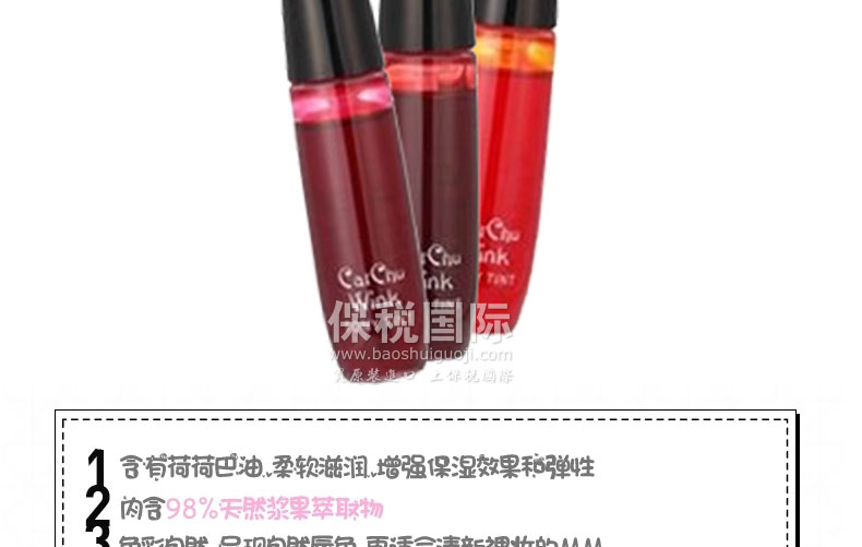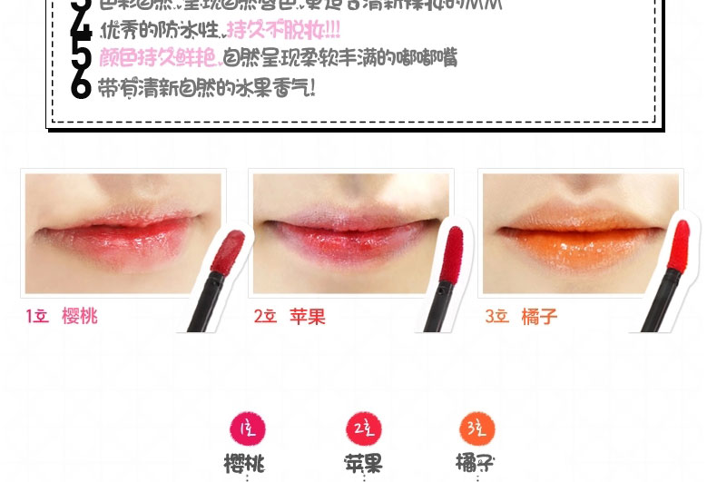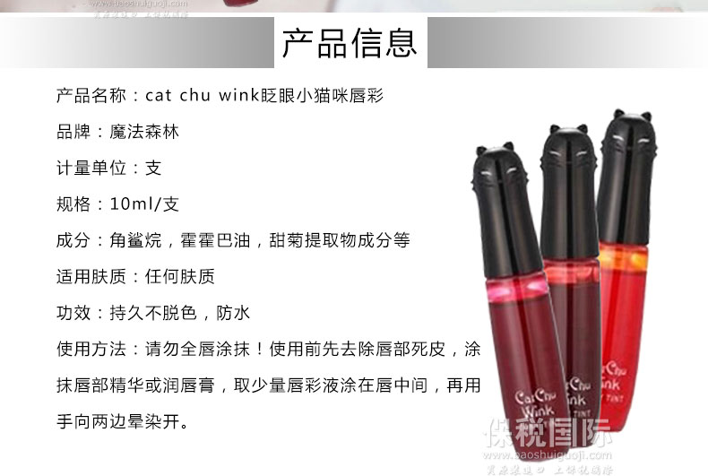 | 產品說明 | Tonymoly魔法森林cat chu wink眨眼小貓咪 持久不脫色防水 唇彩 1#櫻桃色 2#蘋果色 3#橙色 —— 1.持久不脫色防水,三色可選 2.純天然成分溫和無刺激,紅潤的嘴唇略帶清香。 3.可愛的設計包裝,展示出無盡的有趣可愛。 使用方法:請勿全唇涂抹!使用前先去除唇部死皮,涂抹唇部精華或潤唇膏,取少量唇彩液涂在唇中間,再用手向兩邊暈染開。 | |||