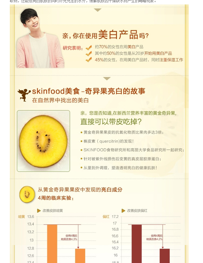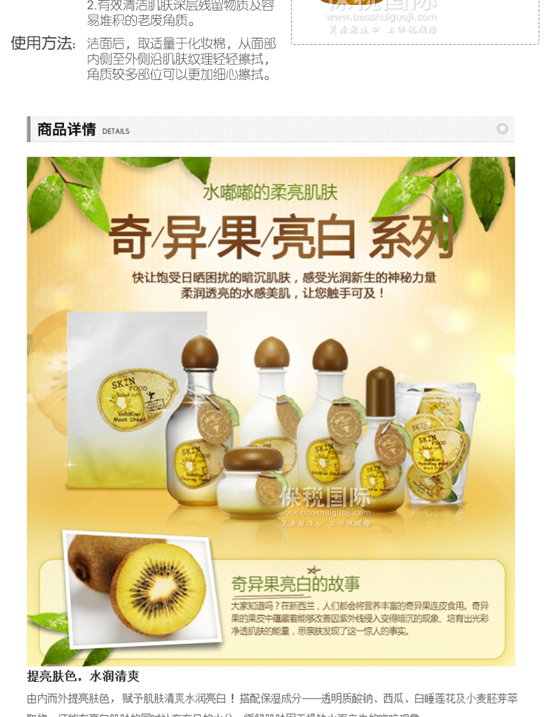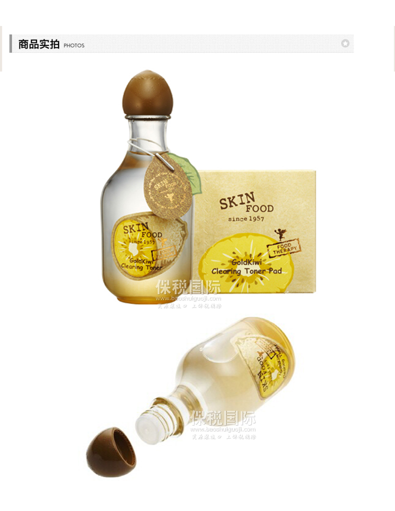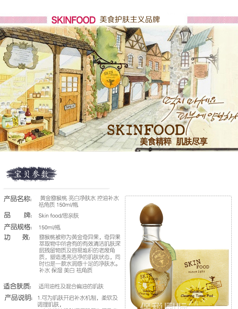 | 產品說明 | SKIN FOOD思親膚 黃金獼猴桃 亮白凈膚水 控油補水祛角質 150ml/瓶—— 1.可為肌膚開啟補水機制,柔軟及調理肌膚, 2.有效清潔肌膚深層殘留物質及容易堆積的老廢角質。 | |||