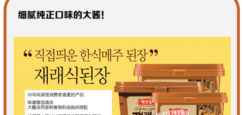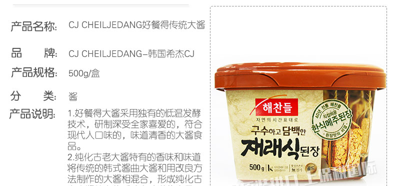 韓式醬湯 好餐得傳統大醬 細膩而又純的大醬 味道香且清淡 500g/盒 —— 1.好餐得大醬采用獨有的低溫發酵技術,研制深受全家喜愛的,符合現代人口味的,味道清香的大醬食品。 2.純化古老大醬特有的香味和味道將傳統的韓式醬曲大醬和用改良方法制作的大醬相混合,形成純化古老大醬特有的香味和味道的產品。 3.大醬用低溫發酵(10℃-20℃)進行2次發酵,激發細膩而又深厚的味道。在煮湯時釋放噴香的味道和香味,不甜不咸,符合我們的口味。 4.為了在冰箱存放和使用的便利采用易拉罐型包裝。 |