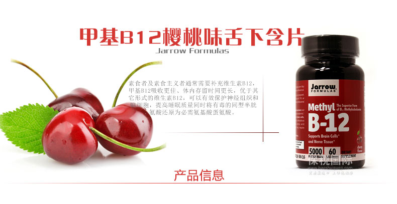 | 產品說明 | Jarrow Formulas賈羅營養品 甲基B12櫻桃味舌下含片? 60粒/瓶—— 1.桃味可咀嚼維生素B12,促進健康的同型半胱氨酸水平 。 2.活性輔酶形式每片5000微克,支持神經遞質與神經元。 | |||