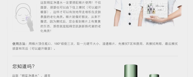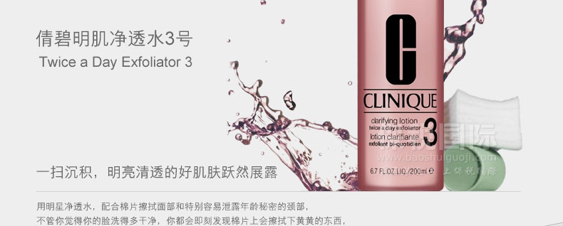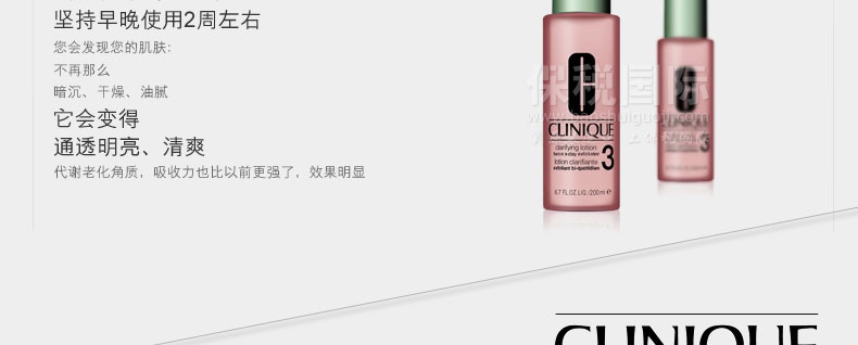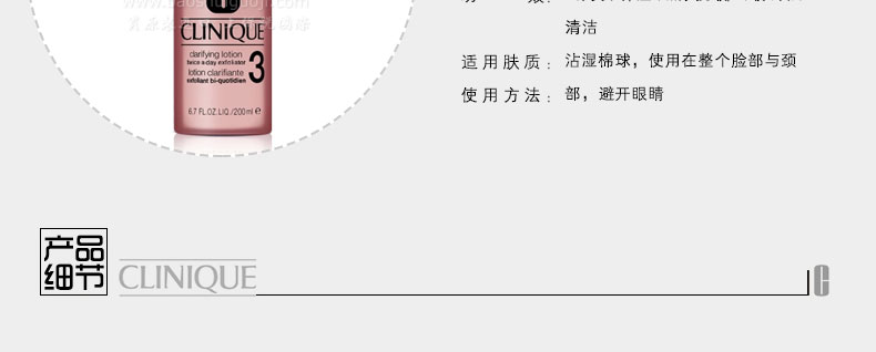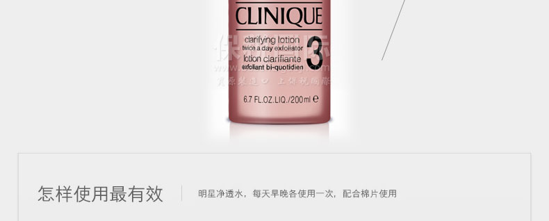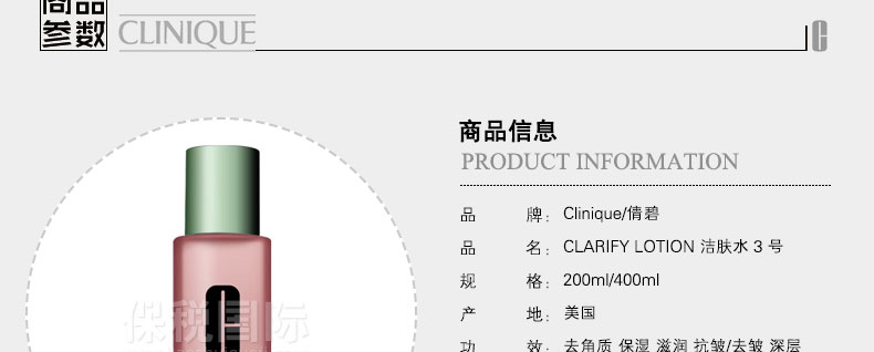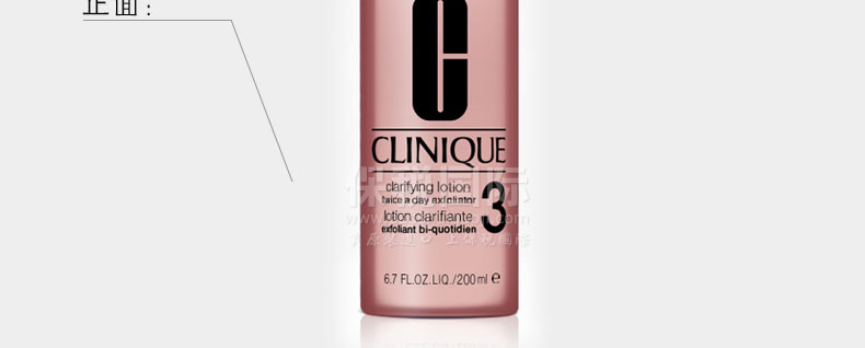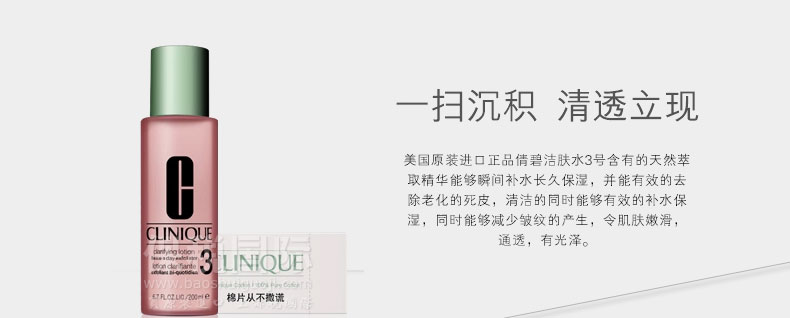 Clinique/倩碧 CLARIFY LOTION 潔膚水 3 號(Version 2) 保濕抗皺潔膚水 (200ml/400ml)—— 1 瞬間補水,長久保濕,含全天然萃取精華,可加強肌膚天然滋潤保護膜,抵御壓力和氣候的襲擊2 溫和清理皮層,促進肌膚自我更新,有效軟化及松脫老化死皮細胞,溫和持續地清理皮層 3 清爽水質配方瞬間發揮奇妙功效,賦予肌膚晶瑩剔透,抵御干燥與外在壓力的侵害 注:敏感肌膚慎用,可隱蔽處進行皮膚測試后使用。 |
