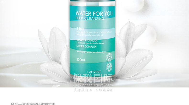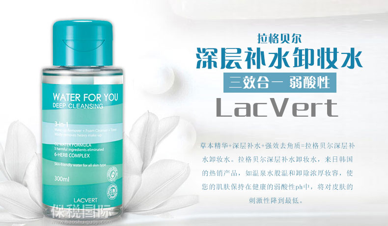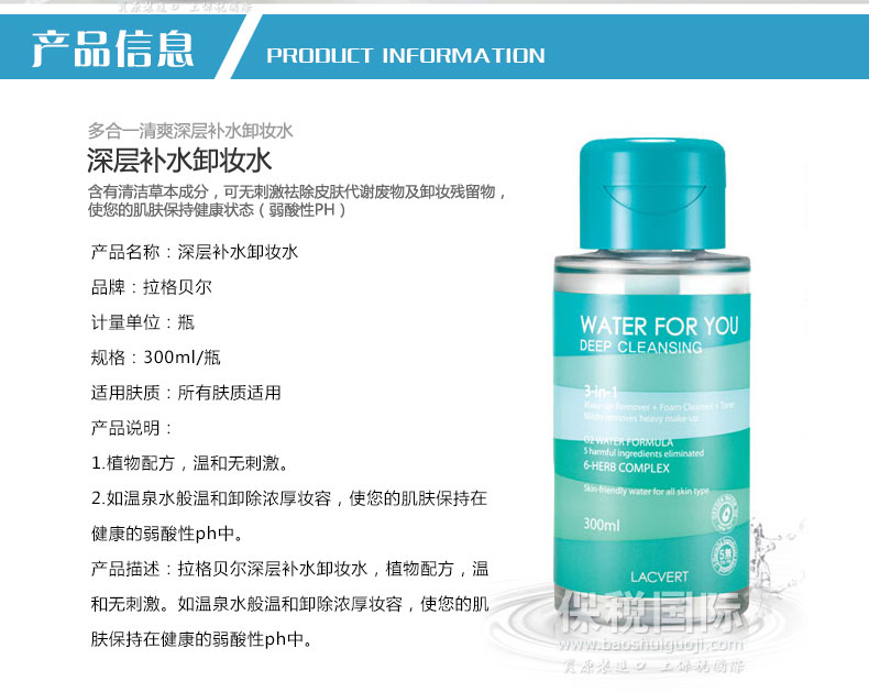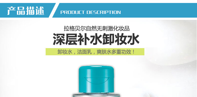 | 產品說明 | 拉格貝爾深層補水卸妝水 三效合一 弱酸性 300ml/瓶—— 1.植物配方,溫和無刺激。 2.如溫泉水般溫和卸除濃厚妝容,使您的肌膚保持在健康的弱酸性ph中。 | |||