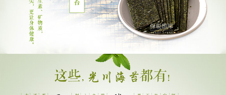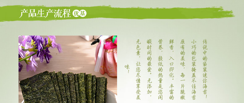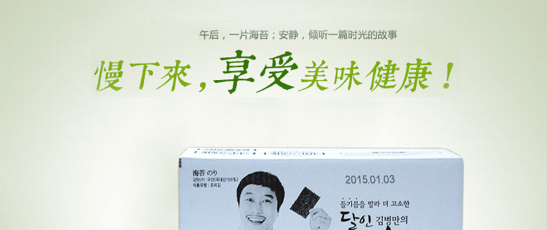| 產品說明 | 光川海苔 達人金炳萬代言-光川迷你袋裝海苔 韓國原裝進口?2g*240包—— 1 迷你袋裝海苔,隨吃隨取,不用擔心吃不完剩余的海苔變軟 2 即使是迷你包裝,仍然保留了海苔原有的香味和營養 3 低鹽無添加,開袋即食,脆嫩美味,不擔心發胖。 | |||