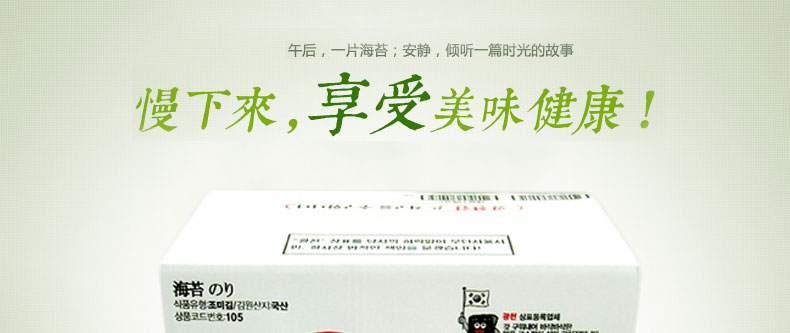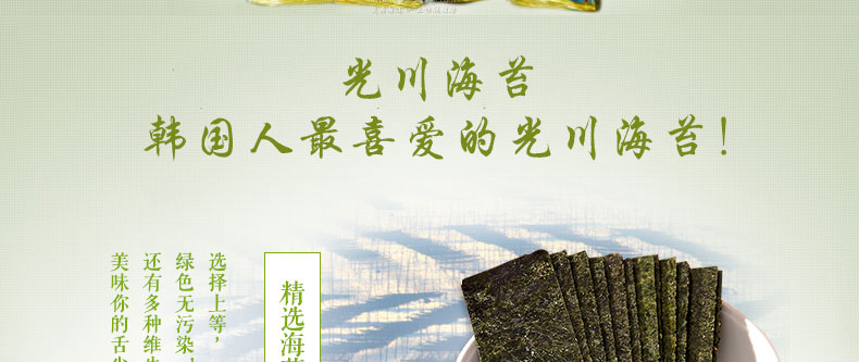 | 產品說明 | 光川海苔 達人金炳萬代言-16層光川海苔 韓國原裝進口5g*128包—— 1 大包裝分小包,保留了海苔原有的營養價值,可以與家人一起分享美味 2 低鈉無添加,無海藻雜質,無色素,輕薄,入口即化,沙沙的清脆聲男女老少都喜愛 3 韓國原裝進口,百分百產自韓國的原材料,讓您不出國也能體味來自海外的美味 | |||