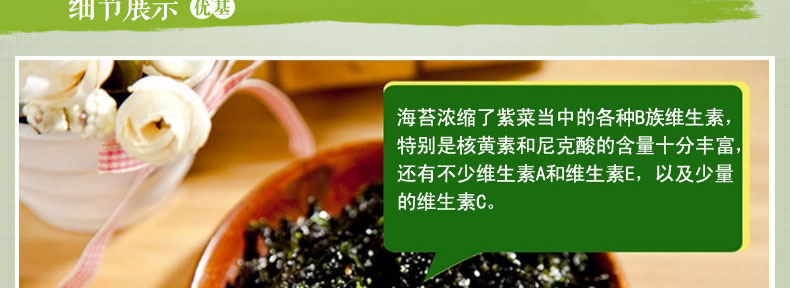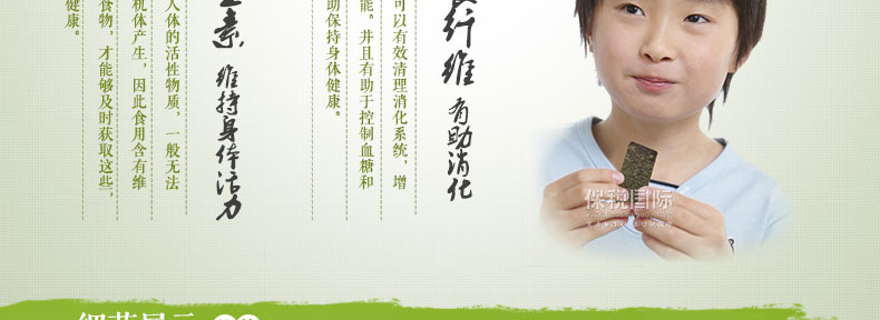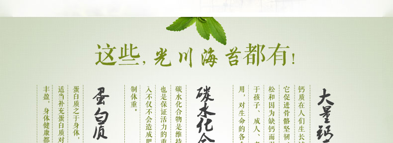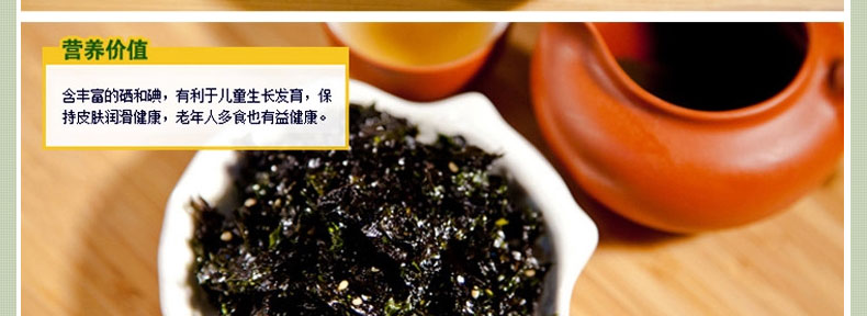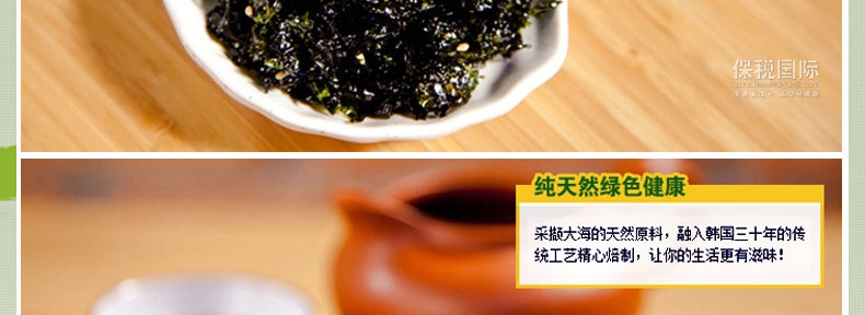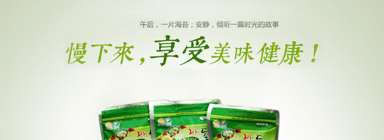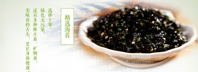 光川海苔 橄欖油綠茶調味海苔 韓國原裝進口?70g/包*20包—— 1 選用優質海苔,加入橄欖油、芝麻、糖、鹽等炒制而成,沒有海苔的腥味,香酥可口 2 熱量低,營養豐富,可即食也可拌飯吃,芝麻的香味與海苔的鮮香揉和在一起使食物更美味 3 內置拉鏈密封條,避免了敞口變軟的問題,保持了海苔的鮮香,更利于保存。 |